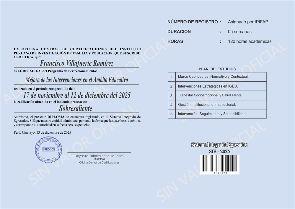 Al concluir el participante obtendrá el Diploma en "Prevención de la Violencia Escolar", con un valor de 120 horas académicas, que mejorará su perfomance en el ámbito laboral o de intervención donde se desempeña o proyecta trabajar.