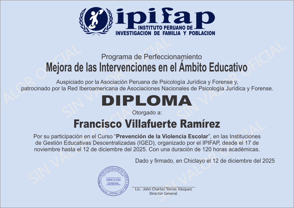 El Certificado cuenta con el aval de la Asociación Peruana de Psicología Jurídica y Forense (APPJF) y, el patrocinio de la Red Iberoamericana de Asociaciones Nacionales de Psicología Jurídica y Forense (RedPsiJu).